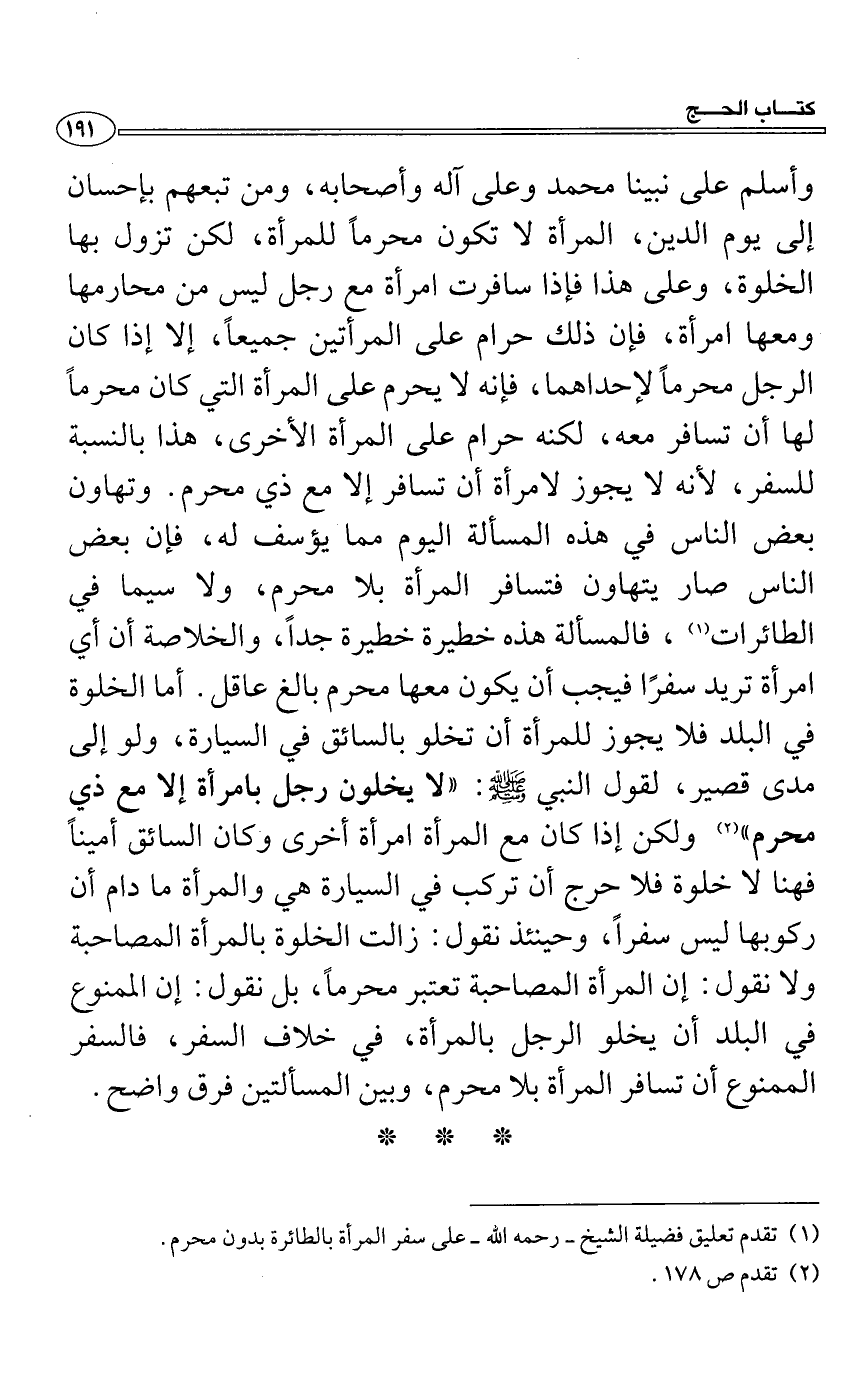 (1) تقدم تعليق فضيلة الشيخ -رحمه الله- على سفر المرأة بالطائرة بدون محرم.