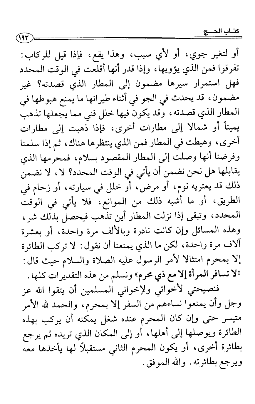 أو لتغير جوي، أو لأي سبب، وهذا يقع، فإذا قيل للركاب: تفرقوا فمن الذي يؤويها، وإذا قدر أنها أقلعت في الوقت المحدد فهل استمرار سيرها مضمون إلى المطار الذي قصدته؟ غير مضمون، قد يحدث في الجو في أثناء طيرانها ما يمنع هبوطها في المطار الذي قصدته، وقد يكون فيها خلل فني مما يجعلها تذهب يميناً أو شمالا إلى مطارات أخرى، فإذا ذهبت إلى مطارات أخرى، وهبطت في المطار فمن الذي ينتظرها هناك، ثم إذا سلمنا وفرضنا أنها وصلت إلى المطار المقصود بسلام، فمحرمها الذي يقابلها هل نحن نضمن أن يأتي في الوقت المحدد؟ لا، لا نضمن ذلك قد يعتريه نوم، أو مرض، أو خلل في سيارته، أو زحام في الطريق، أو ما أشبه ذلك من الموانع، دلا يأتي في الوقت المحدد، وتبقى إذا نزلت المطار أين تذهب فيحصل بذلك شر، وهذه المسائل وإن كانت نادرة وبالألف مرة واحدة، أو بعشرة آلاف مرة واحدة، لكن ما الذي يمنعنا أن نقول: لا تركب الطائرة إلا بمحرم امتثالا لأمر الرسول عليه الصلاة والسلام حيث قال: "لا تسافر المرأة إلا مع ذي محرم " ونسلم من هذه التقديرات كلها.