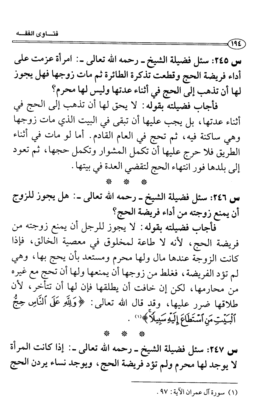 س 246: سئل فضيلة الشيخ- رحمه الله تعالى-: هل يجوز للزوج أن يمنع زوجته من أداء فريضة الحج؟