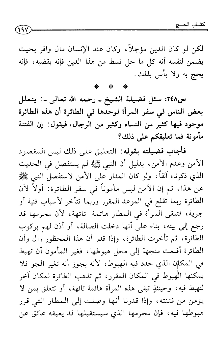 س 248: سئل فضيلة الشيخ- رحمه الله تعالى-: يتعلل بعض الناس في سفر المرأة لوحدها في الطائرة أن هذه الطائرة موجود فيها كثير من النساء وكثير من الرجال، فيقول: إن الفتنة