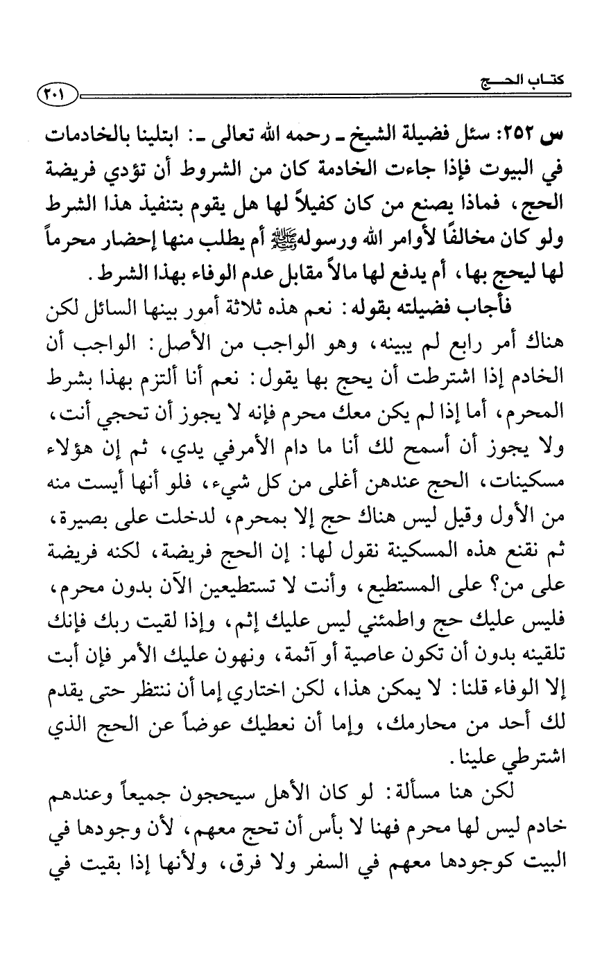 س 252: سئل فضيلة الشيخ- رحمه الله تعالى: ابتلينا بالخادمات في البيوت فإذا جاءت الخادمة كان من الشروط أن تؤدي فريضة الحج، فماذا يصنع من كان كفيلاً لها هل يقوم بتنفيذ هذا الشرط ولو كان مخالفًا لأوامر الله ورسوله - صلى الله عليه وسلم - أم يطلب منها إحضار محرماً