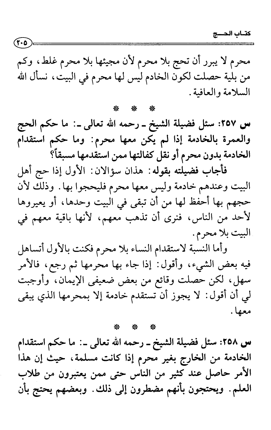 س 257: سئل فضيلة الشيخ- رحمه الله تعالى-: ما حكم الحج والعمرة بالخادمة إذا لم يكن معها محرم: وما حكم استقدام الخادمة بدون محرم أو نقل كفالتها ممن استقدمها مسبقاً؟