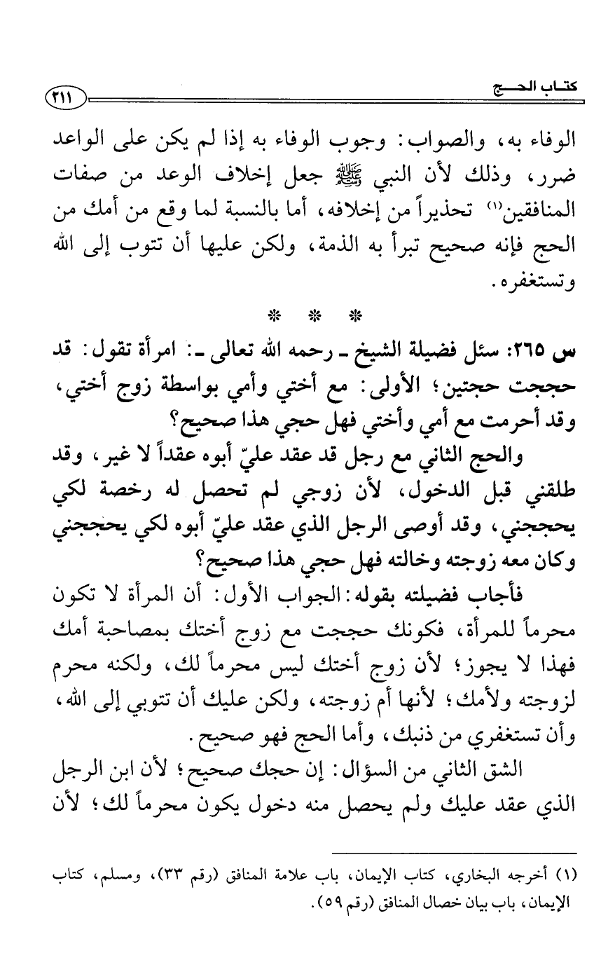 فأجاب فضيلته بقوله: الجواب الأول: أن المرأة لا تكون محرماً للمرأة، فكونك حججت مع زوج أختك بمصاحبة أمك فهذا لا يجوز؟ لأن زوج أختك ليس محرماً لك، ولكنه محرم لزوجته ولأمك؟ لأنها أم زوجته، ولكن عليك أن تتوبي إلى الله، وأن تستغفري من ذنبك، وأما الحج فهو صحيح.