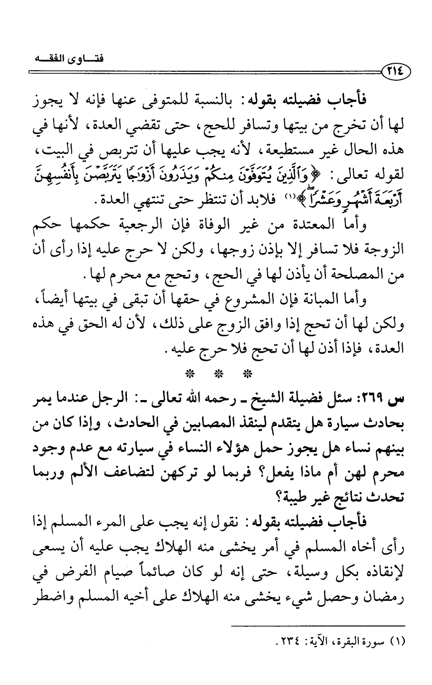 س 269: سئل فضيلة الشيخ- رحمه الله تعالى-: الرجل عندما يمر بحادث سيارة هل يتقدم لينقذ المصابين في الحادث، وإذا كان من بينهم نساء هل يجوز حمل هؤلاء النساء في سيارته مع عدم وجود