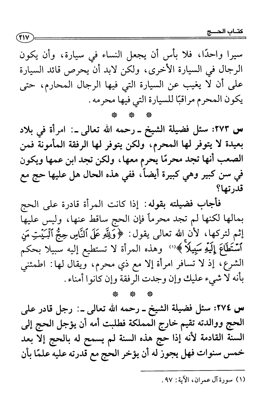 فأجاب فضيلته بقوله: إذا كانت المرأة قادرة على الحج بمالها لكنها لم تجد محرماً فإن الحج ساقط عنها، وليس عليها إثم لتركها، لأن الله تعالى يقول: (وَلِلَّهِ عَلَى النَّاسِ حِجُّ الْبَيْتِ مَنِ اسْتَطَاعَ إِلَيْهِ سَبِيلًا) (1) وهذه المرأة لا تستطيع إليه سبيلا بحكم الشرع، إذ لا تسافر امرأة إلا مع ذي محرم، ويقال لها: اطمئني بأنه لا شيء عليك وإن وجدت الرفقة وإن كانوا أمناء.