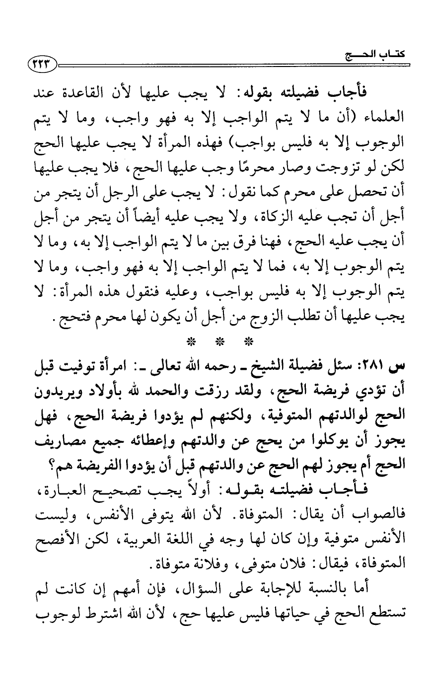 س 281: سئل فضيلة الشيخ -رحمه الله تعالى-: امرأة توفيت قبل أن تؤدي فريضة الحج، ولقد رزقت والحمد لله بأولاد ويريدون الحج لوالدتهم المتوفية، ولكنهم لم يؤدوا فريضة الحج، فهل