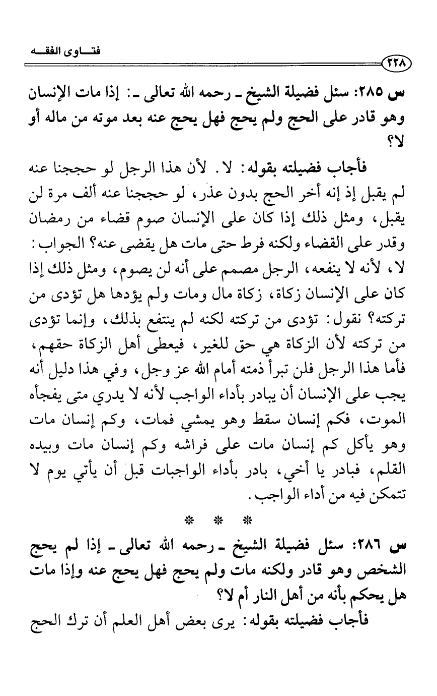 فأجاب فضيلته بقوله: لا. لأن هذا الرجل لو حججنا عنه لم يقبل إذ إنه أخر الحج بدون عذر، لو حججنا عنه ألف مرة لن يقبل، ومثل ذلك إذا كان على الإنسان صوم قضاء من رمضان وقدر على القضاء ولكنه فرط حتى مات هل يقضى عنه؟ الجواب: لا، لأنه لا ينفعه، الرجل مصمم على أنه لن يصوم، ومثل ذلك إذا كان على الإنسان زكاة، زكاة مال ومات ولم يؤدها هل تؤدى من تركته؟ نقول: تؤدى من تركته لكنه لم ينتفع بذلك، وإنما تؤدى من تركته لأن الزكاة هي حق للغير، فيعطى أهل الزكاة حقهم، فأما هذا الرجل فلن تبرأ ذمته أمام الله عز وجل، وفي هذا دليل أنه يجب على الإنسان أن يبادر بأداء الواجب لأنه لا يدري متى يفاجئه الموت، فكم إنسان سقط وهو يمشي فمات، وكم إنسان مات وهو يأكل كم إنسان مات على فراشه وكم إنسان مات وبيده القلم، فبادر يا أخي، بادر بأداء الواجبات قبل أن يأتي يوم لا تتمكن فيه من أداء الواجب.