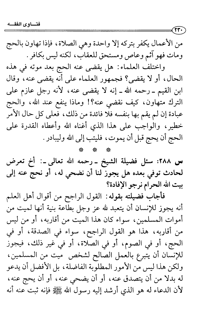 س 288: سئل فضيلة الشيخ- رحمه الله تعالى-: أخ تعرض لحادث توفي بعده هل يجوز لنا أن نضحي له، أو نحج عنه إلى بيت الله الحرام نرجو الإفادة؟