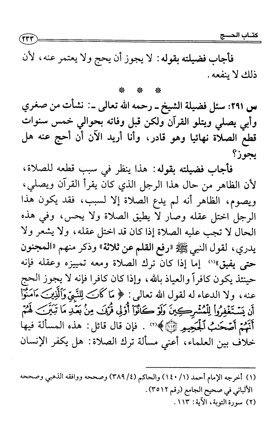 فأجاب فضيلته بقوله: هذا ينظر في سبب قطعه للصلاة، لأن الظاهر من حال هذا الرجل الذي كان يقرأ القرآن ويصلي، ويصوم، الظاهر أنه لم يدع الصلاة إلا لسبب، فقد يكون هذا الرجل اختل عقله وصار لا يطيق الصلاة ولا يحس، وفي هذه الحال لا تجب عليه الصلاة إذا كان قد اختل عقله، ولا يشعر ولا يدري، لقول النبي - صلى الله عليه وسلم - "رفع القلم عن ثلاثة" وذكر منهم "المجنون حتى يفيق " (1) إما إذا كان ترك الصلاة ومعه تمييزه وعقله فإنه حينئذ يكون كافراً والعياذ بالله، وإذا كان كافرا فإنه لا يجوز الحج عنه، ولا الدعاء له لقول الله تعالى: (مَا كَانَ لِلنَّبِيِّ وَالَّذِينَ آَمَنُوا أَنْ يَسْتَغْفِرُوا لِلْمُشْرِكِينَ وَلَوْ كَانُوا أُولِي قُرْبَى مِنْ بَعْدِ مَا تَبَيَّنَ لَهُمْ أَنَّهُمْ أَصْحَابُ الْجَحِيمِ (113)) (2) . فإن قال قائل: هذه المسألة فيها خلاف بين العلماء، أعني مسألة ترك الصلاة: هل يكفر الإنسان
