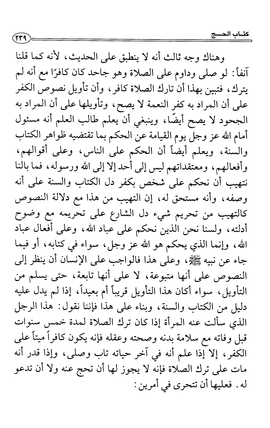 التأويل، سواء أكان هذا التأويل قريباً أم بعيداً، إذا لم يدل عليه دليل من الكتاب والسنة، وبناء على هذا فإننا نقول: هذا الرجل الذي سألت عنه المرأة إذا كان ترك الصلاة لمدة خمس سنوات قبل وفاته مع سلامة بدنه وصحته وعقله فإنه يكون كافراً ميتاً على الكفر، إلا إذا علم أنه في آخر حياته تاب وصلى، وإذا قدر أنه مات على ترك الصلاة فإنه لا يجوز لها أن تحج عنه ولا أن تدعو له. فعليها أن تتحرى في أمرين: