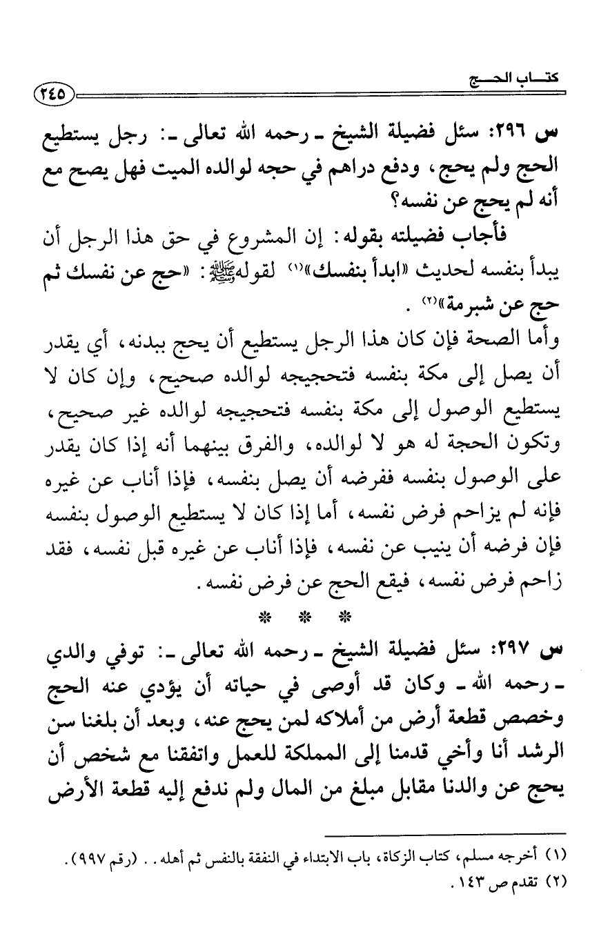 س 296: سئل فضيلة الشيخ- رحمه الله تعالى-: رجل يستطيع الحج ولم يحج، ودفع دراهم في حجه لوالده الميت فهل يصح مع أنه لم يحج عن نفسه؟