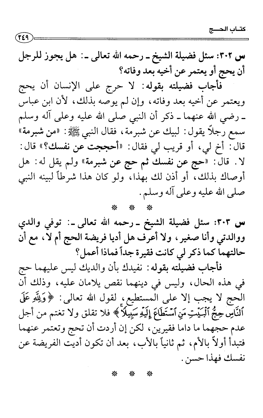 س 302: سئل فضيلة الشيخ- رحمه الله تعالى-: هل يجوز للرجل أن يحج أو يعتمر عن أخيه بعد وفاته؟