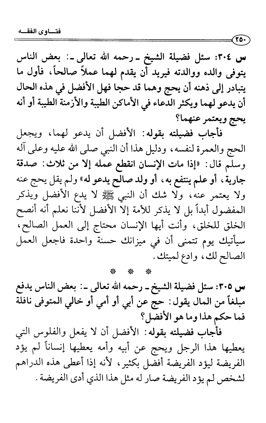 س 304: سئل فضيلة الشيخ- رحمه الله تعالى-: بعض الناس يتوفى والده ووالدته فيريد أن يقدم لهما عملاً صالحاً، فأول ما يتبادر إلى ذهنه أن يحج وهما قد حجا فهل الأفضل في هذه الحال أن يدعو لهما ويكثر الدعاء في الأماكن الطيبة والأزمنة الطيبة أو أنه يحج ويعتمر عنهما؟