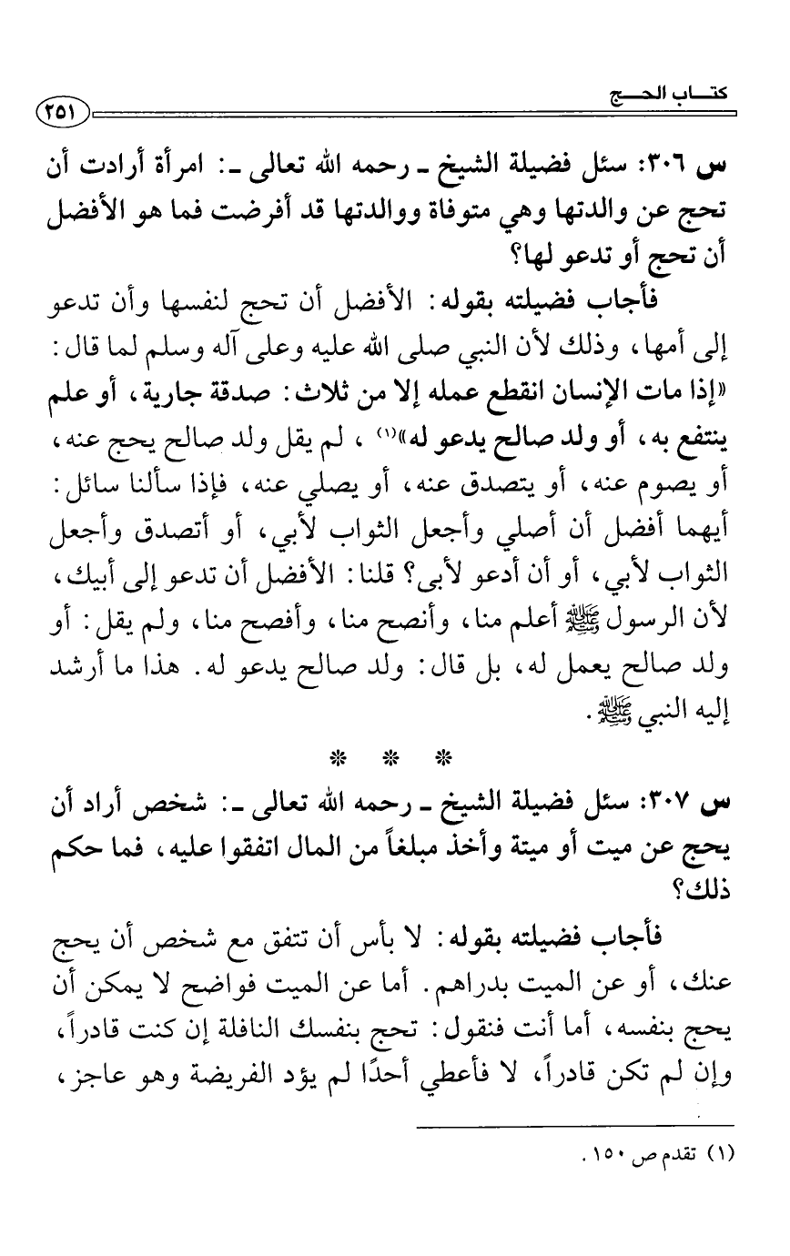 س 306: سئل فضيلة الشيخ- رحمه الله تعالى-: امرأة أرادت أن تحج عن والدتها وهي متوفاة ووالدتها قد أفرضت فما هو الأفضل أن تحج أو تدعو لها؟