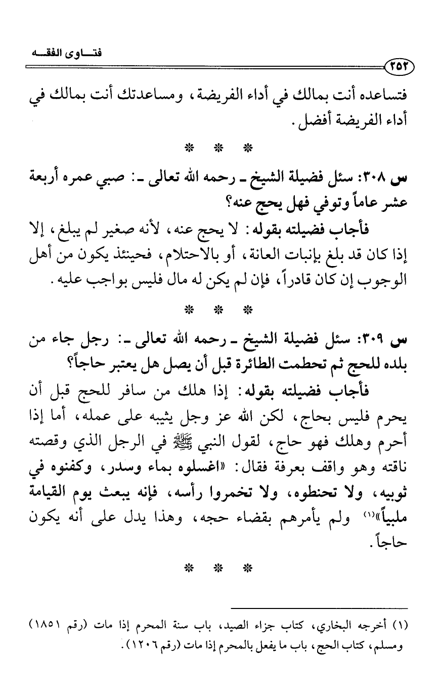 فأجاب فضيلته بقوله: إذا هلك من سافر للحج قبل أن يحرم فليس بحاج، لكن الله عز وجل يثيبه على عمله، أما إذا أحرم وهلك فهو حاج، لقول النبي - صلى الله عليه وسلم - في الرجل الذي وقصته ناقته وهو واقف بعرفة فقال: "اغسلوه بماء وسدر، وكفنوه في ثوبيه، ولا تحنطوه، ولا تخمروا رأسه، فإنه يبعث يوم القيامة ملبياً" (1) ولم يأمرهم بقضاء حجه، وهذا يدل على أنه يكون