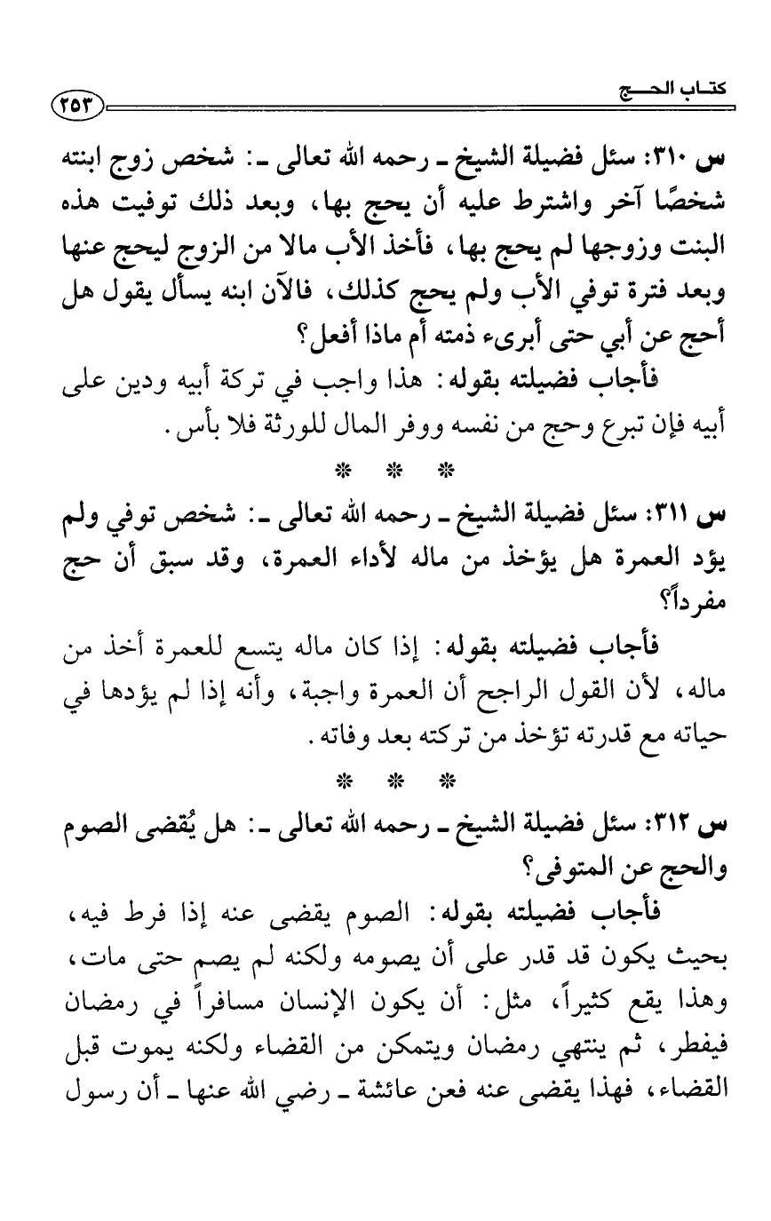 س 312: سئل فضيلة الشيخ- رحمه الله تعالى-: هل يُقضى الصوم والحج عن المتوفى؟