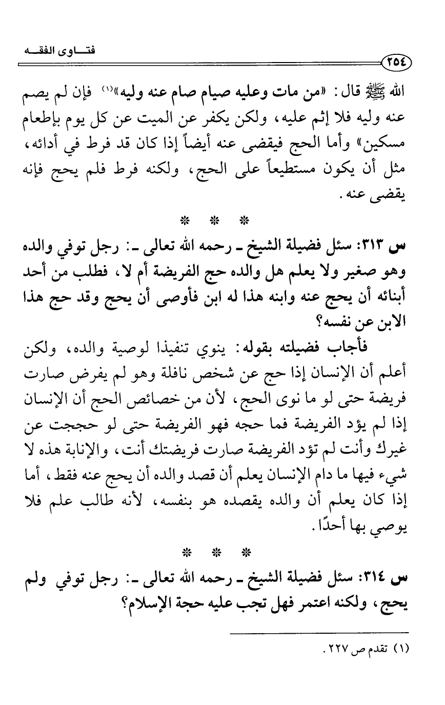 س 314: سئل فضيلة الشيخ- رحمه الله تعالى-: رجل توفي ولم يحج، ولكنه اعتمر فهل تجب عليه حجة الإسلام؟