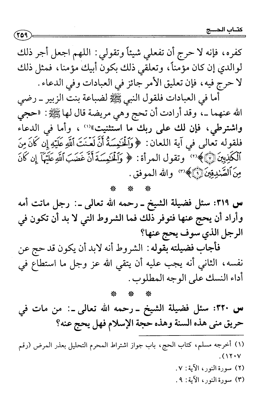 س 319: سئل فضيلة الشيخ- رحمه الله تعالى-: رجل ماتت أمه وأراد أن يحج عنها فتوفر ذلك فما الشروط التي لا بد أن تكون في الرجل الذي سوف يحج عنها؟