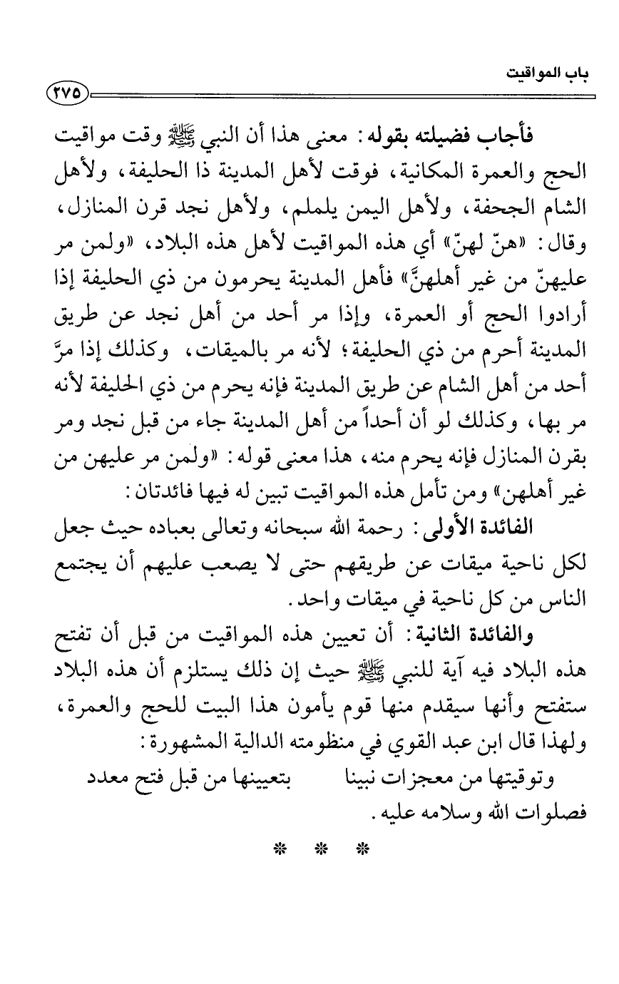 والفائدة الثانية: أن تعيين هذه المواقيت من قبل أن تفتح هذه البلاد فيه آية للنبي - صلى الله عليه وسلم - حيث إن ذلك يستلزم أن هذه البلاد ستفتح وأنها سيقدم منها قوم يأمون هذا البيت للحج والعمرة، ولهذا قال ابن عبد القوي في منظومته الدالية المشهورة: وتوقيتها من معجزات نبينا بتعيينها من قبل فتح معدد فصلوات الله وسلامه عليه.