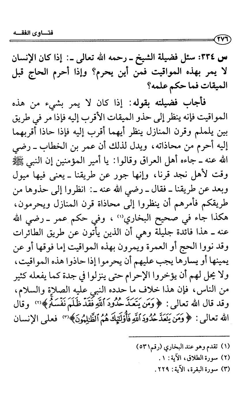س 334: سئل فضيلة الشيخ- رحمه الله تعالى-: إذا كان الإنسان لا يمر بهذه المواقيت فمن أين يحرم؟ وإذا أحرم الحاج قبل الميقات فما حكم علمه؟