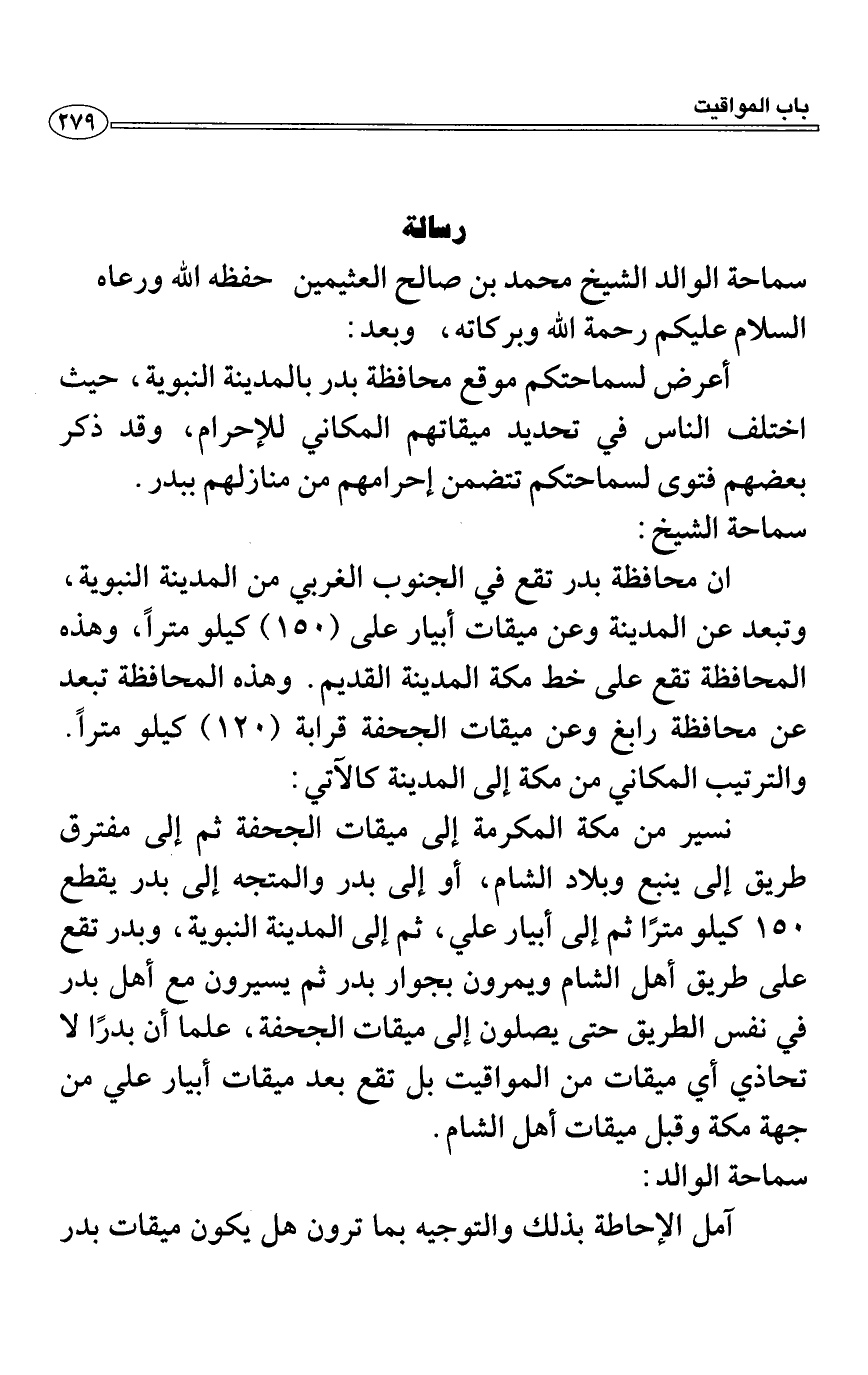 أعرض لسماحتكم موقع محافظة بدر بالمدينة النبوية، حيث اختلف الناس في تحديد ميقاتهم المكاني للإحرام، وقد ذكر بعضهم فتوى لسماحتكم تتضمن إحرامهم من منازلهم ببدر.