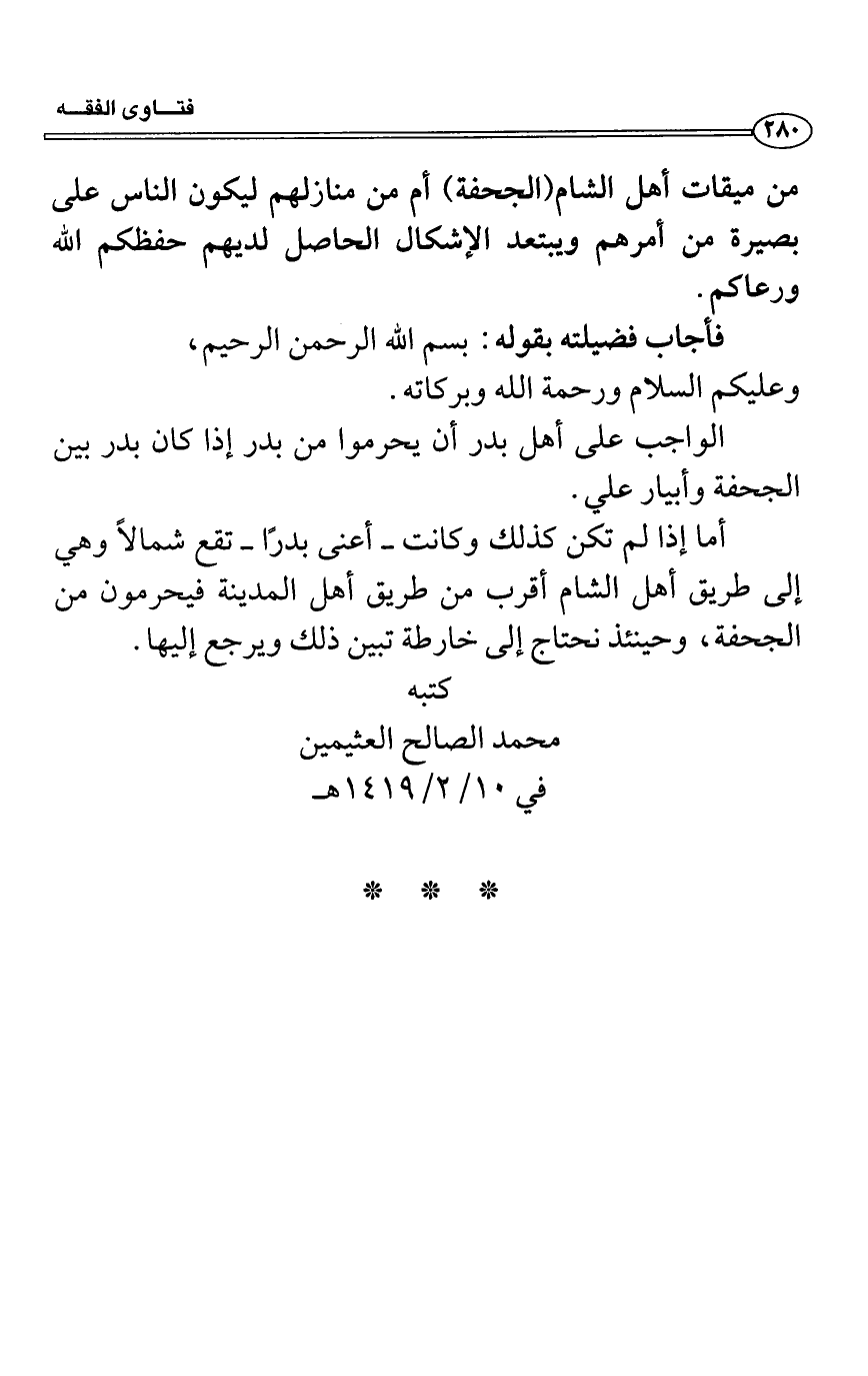 أما إذا لم تكن كذلك وكانت- أعنى بدرًا- تقع شمالاً وهي إلى طريق أهل الشام أقرب من طريق أهل المدينة فيحرمون من الجحفة، وحينئذ نحتاج إلى خارطة تبين ذلك ويرجع إليها.