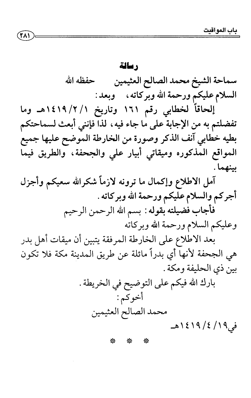 إلحاقاً لخطابي رقم 161 وتاريخ 1/2/1419 هـ وما تفضلتم به من الإجابة على ما جاء فيه، لذا فإنني أبعث لسماحتكم بطيه خطابي آنف الذكر وصورة من الخارطة الموضح عليها جميع المواقع المذكوره وميقاتي أبيار علي والجحفة، والطريق فيما بينهما.