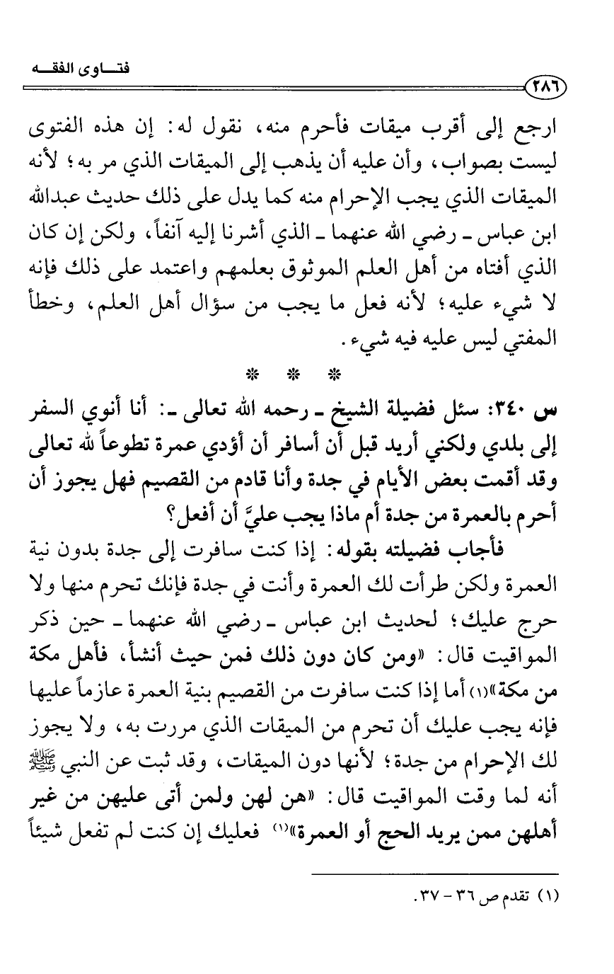 س 340: سئل فضيلة الشيخ- رحمه الله تعالى-: أنا أنوي السفر إلى بلدي ولكني أريد قبل أن أسافر أن أؤدي عمرة تطوعاً لله تعالى وقد أقمت بعض الأيام في جدة وأنا قادم من القصيم فهل يجوز أن أحرم بالعمرة من جدة أم ماذا يجب عليَّ أن أفعل؟