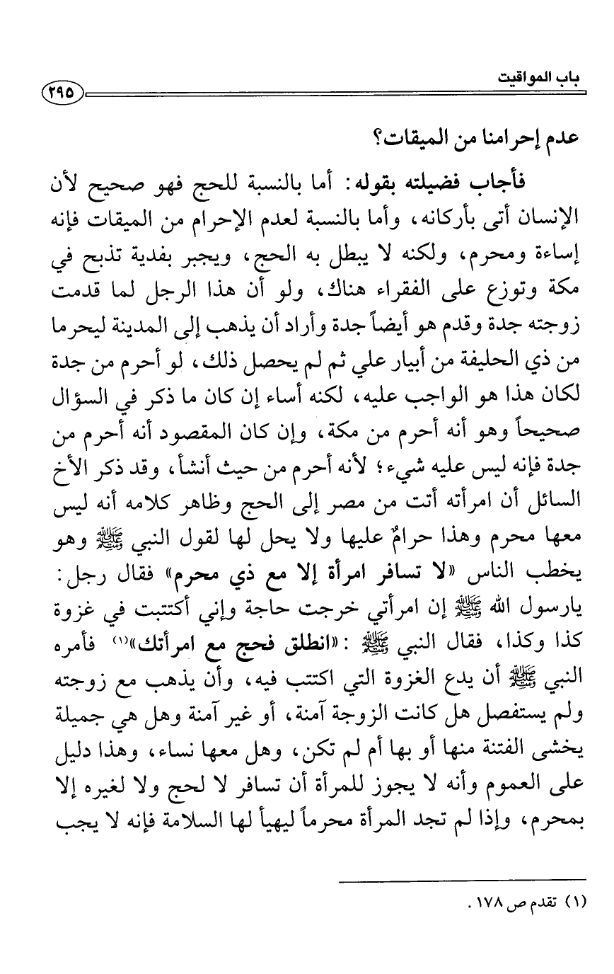 فأجاب فضيلته بقوله: أما بالنسبة للحج فهو صحيح لأن الإنسان أتى بأركانه، وأما بالنسبة لعدم الإحرام من الميقات فإنه إساءة ومحرم، ولكنه لا يبطل به الحج، ويجبر بفدية تذبح في مكة وتوزع على الفقراء هناك، ولو أن هذا الرجل لما قدمت زوجته جدة وقدم هو أيضاً جدة وأراد أن يذهب إلى المدينة ليحرما من ذي الحليفة من أبيار علي ثم لم يحصل ذلك، لو أحرم من جدة لكان هذا هو الواجب عليه، لكنه أساء إن كان ما ذكر في السؤال صحيحاً وهو أنه أحرم من مكة، وإن كان المقصود أنه أحرم من جدة فإنه ليس عليه شيء؛ لأنه أحرم من حيث أنشأ، وقد ذكر الأخ السائل أن امرأته أتت من مصر إلى الحج وظاهر كلامه أنه ليس معها محرم وهذا حرامٌ عليها ولا يحل لها لقول النبي - صلى الله عليه وسلم - وهو يخطب الناس "لا تسافر امرأة إلا مع ذي محرم " فقال رجل: يا رسول الله - صلى الله عليه وسلم - إن امرأتي خرجت حاجة وإني أكتتبت في غزوة
