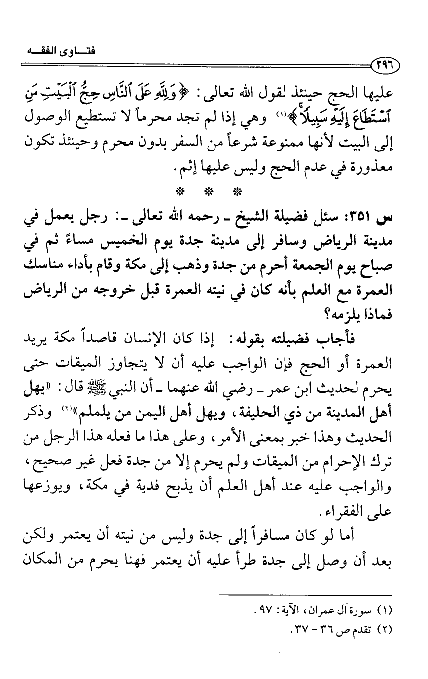 س 351: سئل فضيلة الشيخ- رحمه الله تعالى-: رجل يعمل في مدينة الرياض وسافر إلى مدينة جدة يوم الخميس مساءً ثم في صباح يوم الجمعة أحرم من جدة وذهب إلى مكة وقام بأداء مناسك