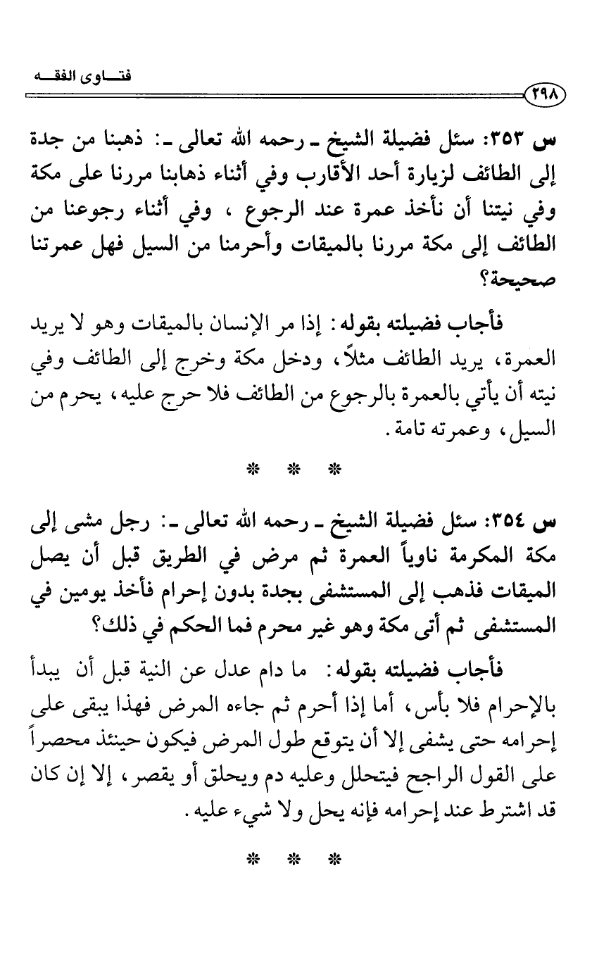 س 353: سئل فضيلة الشيخ- رحمه الله تعالى-: ذهبنا من جدة إلى الطائف لزيارة أحد الأقارب وفي أثناء ذهابنا مررنا على مكة وفي نيتنا أن نأخذ عمرة عند الرجوع، وفي أثناء رجوعنا من