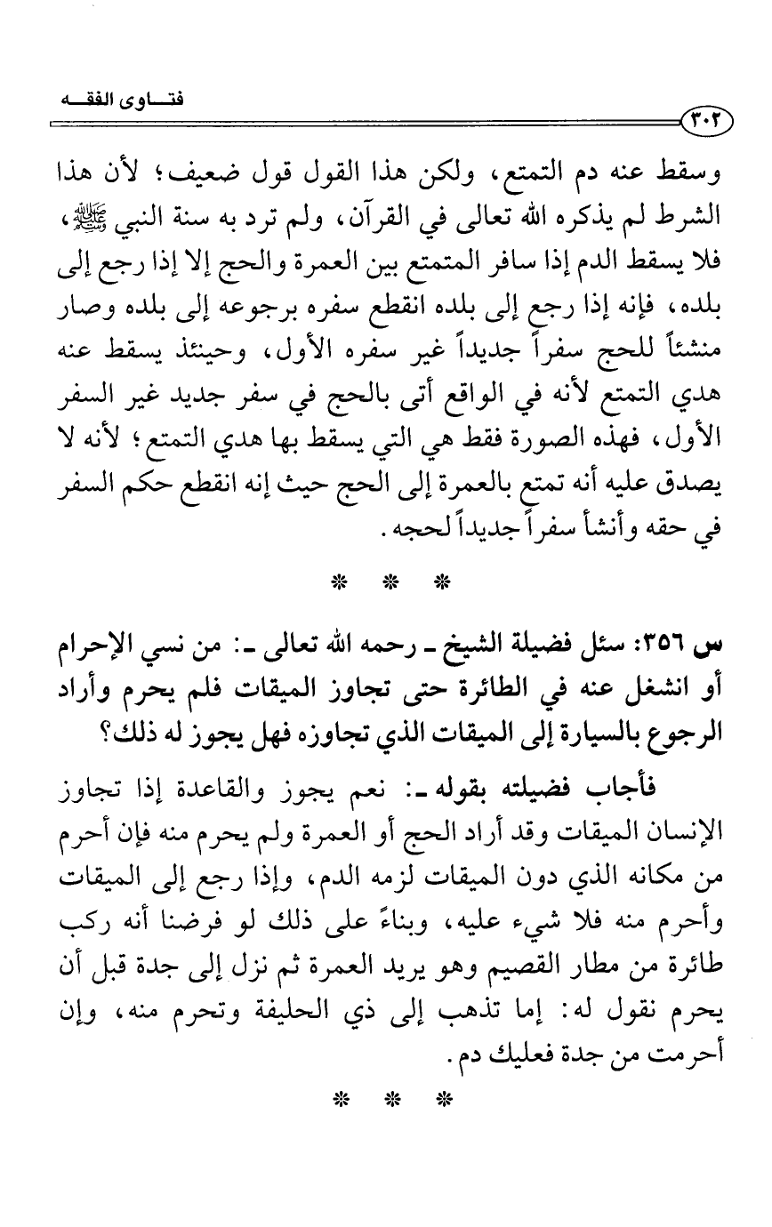 وسقط عنه دم التمتع، ولكن هذا القول قول ضعيف؛ لأن هذا الشرط لم يذكره الله تعالى في القرآن، ولم ترد به سنة النبي - صلى الله عليه وسلم -، فلا يسقط الدم إذا سافر المتمتع بين العمرة والحج إلا إذا رجع إلى بلده، فإنه إذا رجع إلى بلده انقطع سفره برجوعه إلى بلده وصار