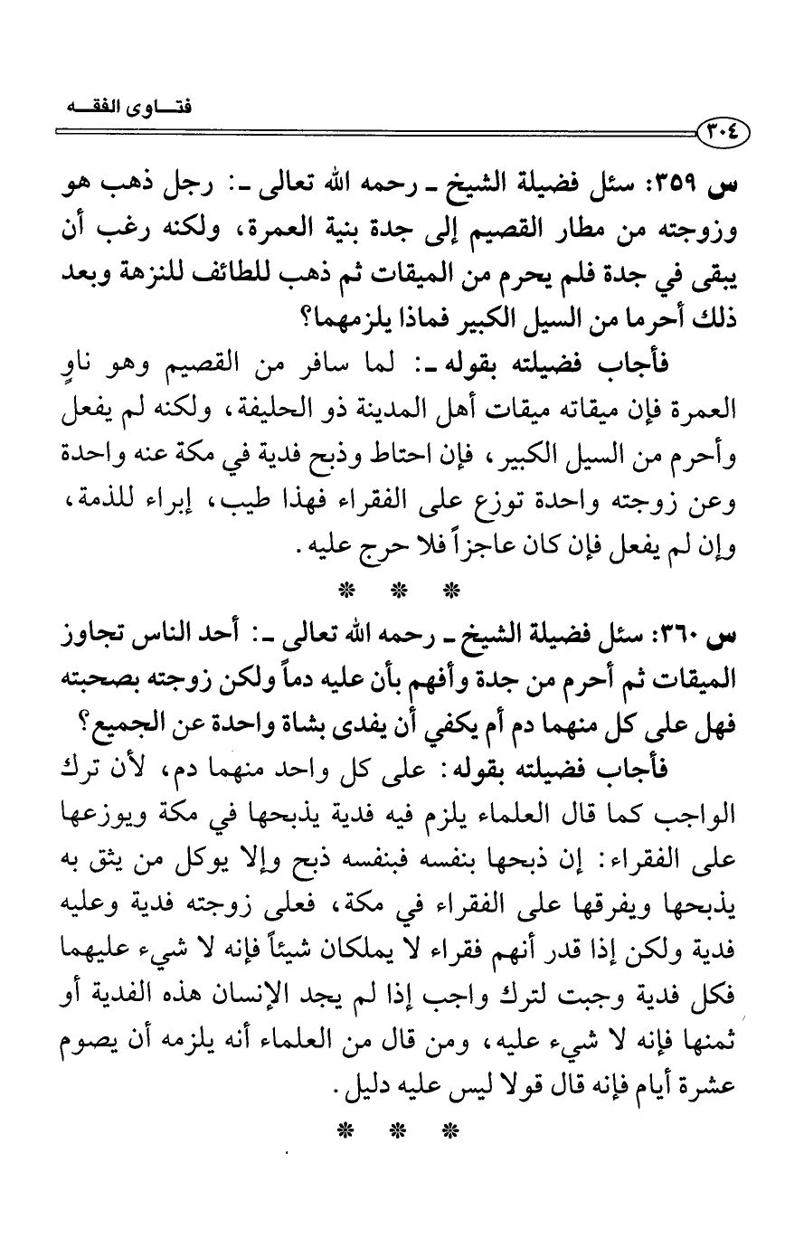 س 359: سئل فضيلة الشيخ- رحمه الله تعالى-: رجل ذهب هو وزوجته من مطار القصيم إلى جدة بنية العمرة، ولكنه رغب أن يبقى في جدة فلم يحرم من الميقات ثم ذهب للطائف للنزهة وبعد