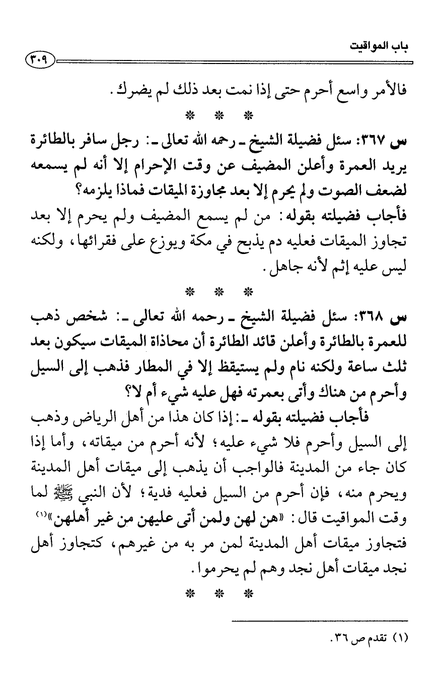 س 368: سئل فضيلة الشيخ- رحمه الله تعالى-: شخص ذهب للعمرة بالطائرة وأعلن قائد الطائرة أن محاذاة الميقات سيكون بعد ثلث ساعة ولكنه نام ولم يستيقظ إلا في المطار فذهب إلى السيل