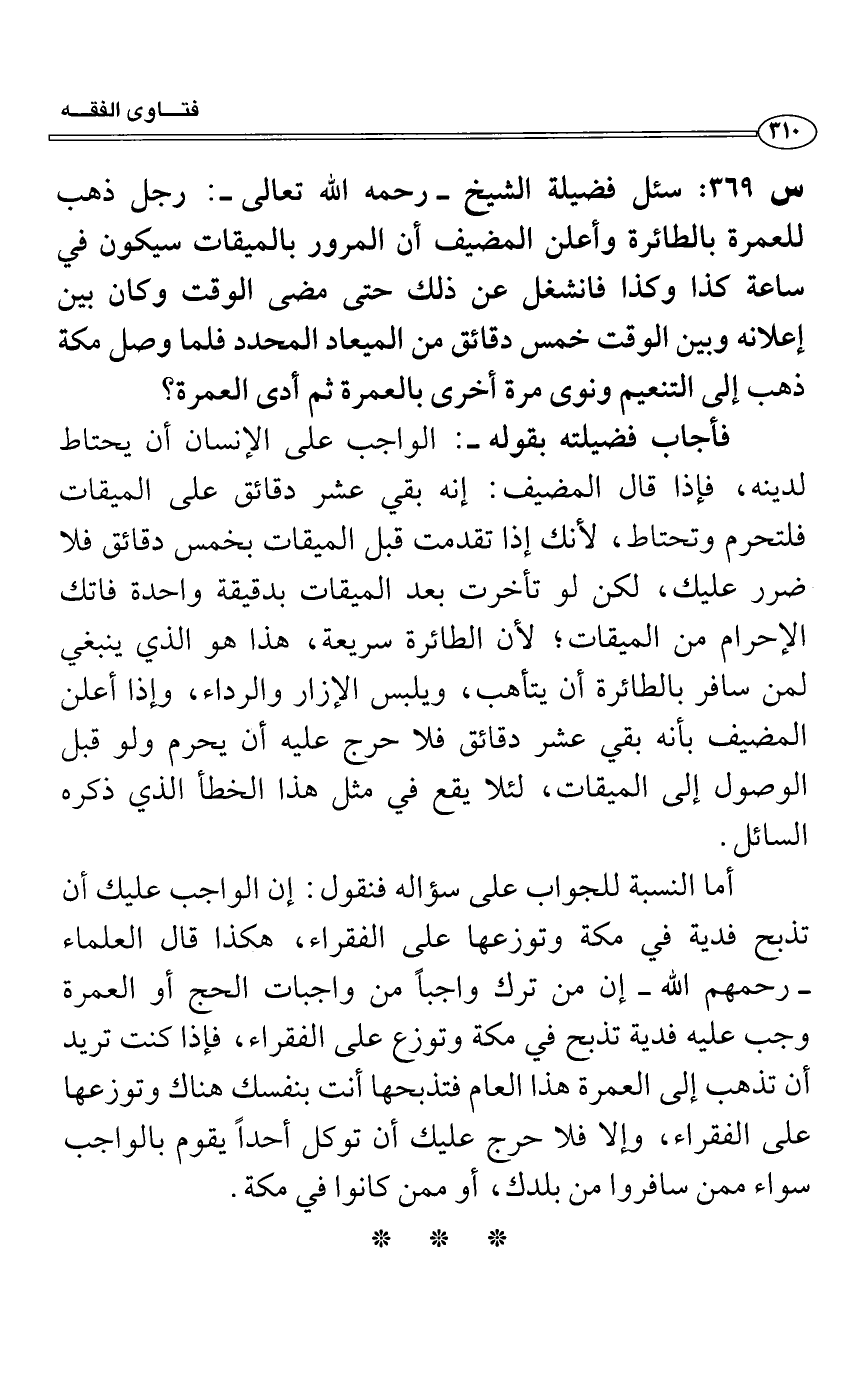 س 369: سئل فضيلة الشيخ- رحمه الله تعالى-: رجل ذهب للعمرة بالطائرة وأعلن المضيف أن المرور بالميقات سيكون في ساعة كذا وكذا فانشغل عن ذلك حتى مضى الوقت وكان بين إعلانه وبين الوقت خمس دقائق من الميعاد المحدد فلما وصل مكة ذهب إلى التنعيم ونوى مرة أخرى بالعمرة ثم أدى العمرة؟