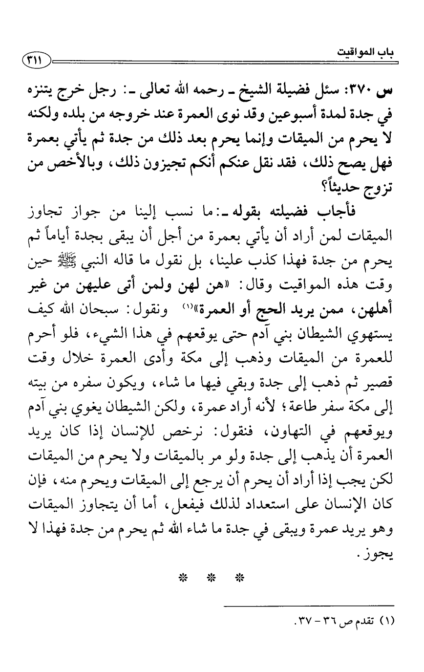 س 370: سئل فضيلة الشيخ- رحمه الله تعالى-: رجل خرج يتنزه في جدة لمدة أسبوعين وقد نوى العمرة عند خروجه من بلده ولكنه لا يحرم من الميقات وإنما يحرم بعد ذلك من جدة ثم يأتي بعمرة