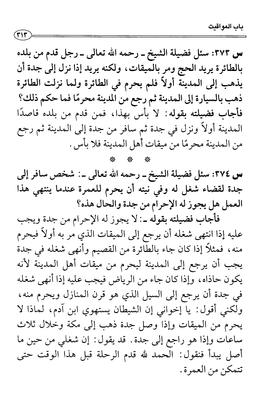 س 374: سئل فضيلة الشيخ- رحمه الله تعالى-: شخص سافر إلى جدة لقضاء شغل له وفي نيته أن يحرم للعمرة عندما ينتهي هذا العمل هل يجوز له الإحرام من جدة والحال هذه؟