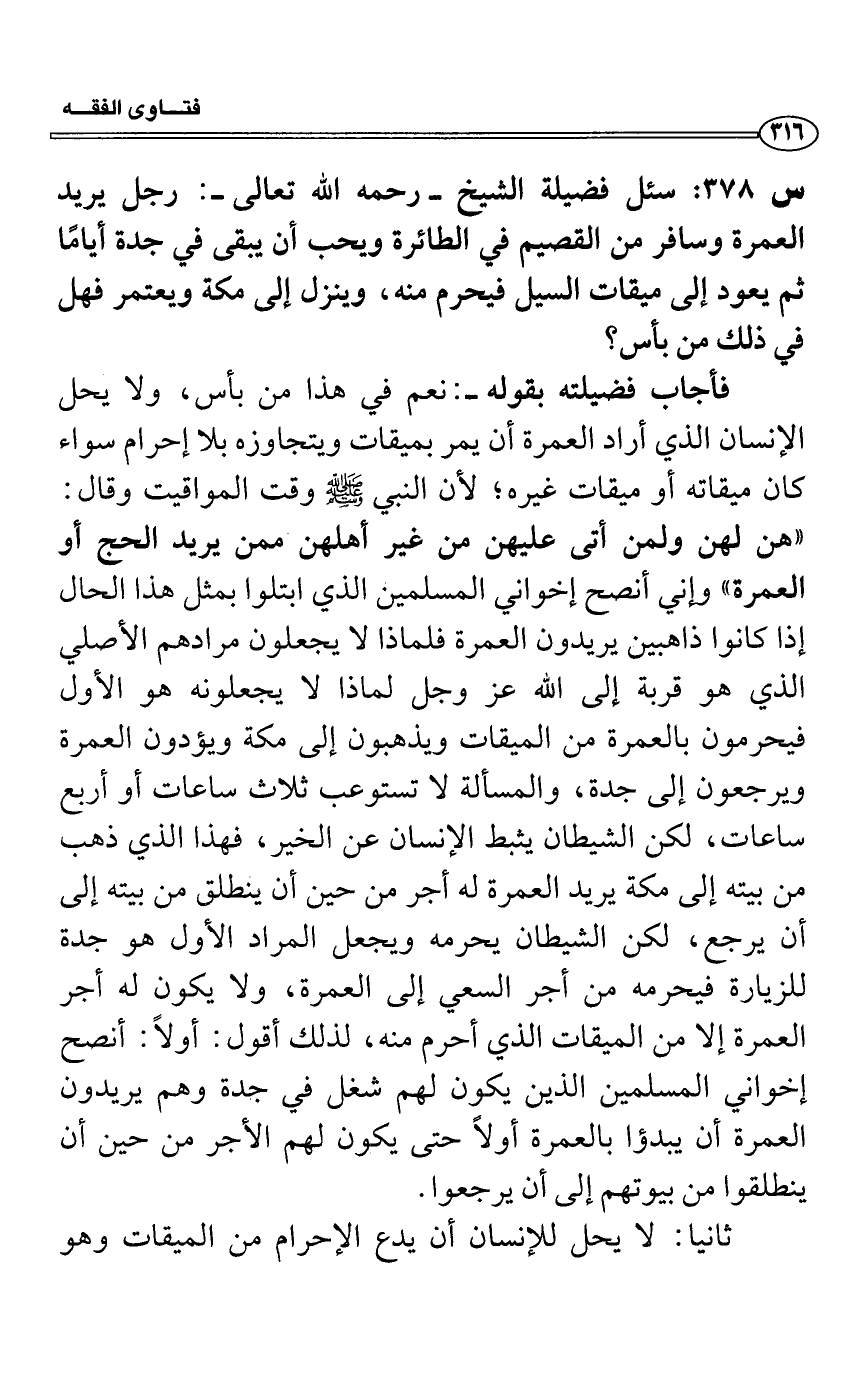 فأجاب فضيلته بقوله-: نعم في هذا من بأس، ولا يحل الإنسان الذي أراد العمرة أن يمر بميقات ويتجاوزه بلا إحرام سواء كان ميقاته أو ميقات غيره؛ لأن النبي - صلى الله عليه وسلم - وقت المواقيت وقال: "هن لهن ولمن أتى عليهن من غير أهلهن ممن يريد الحج أو العمرة" وإني أنصح إخواني المسلمين الذي ابتلوا بمثل هذا الحال إذا كانوا ذاهبين يريدون العمرة فلماذا لا يجعلون مرادهم الأصلي الذي هو قربة إلى الله عز وجل لماذا لا يجعلونه هو الأول فيحرمون بالعمرة من الميقات ويذهبون إلى مكة ويؤدون العمرة ويرجعون إلى جدة، والمسألة لا تستوعب ثلاث ساعات أو أربع