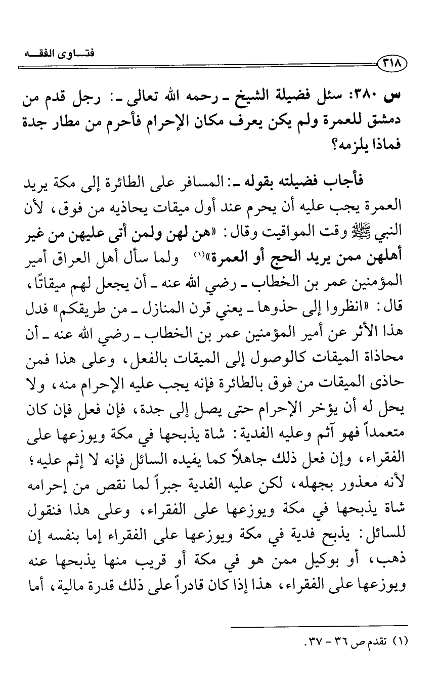 س 380: سئل فضيلة الشيخ- رحمه الله تعالى-: رجل قدم من دمشق للعمرة ولم يكن يعرف مكان الإحرام فأحرم من مطار جدة فماذا يلزمه؟