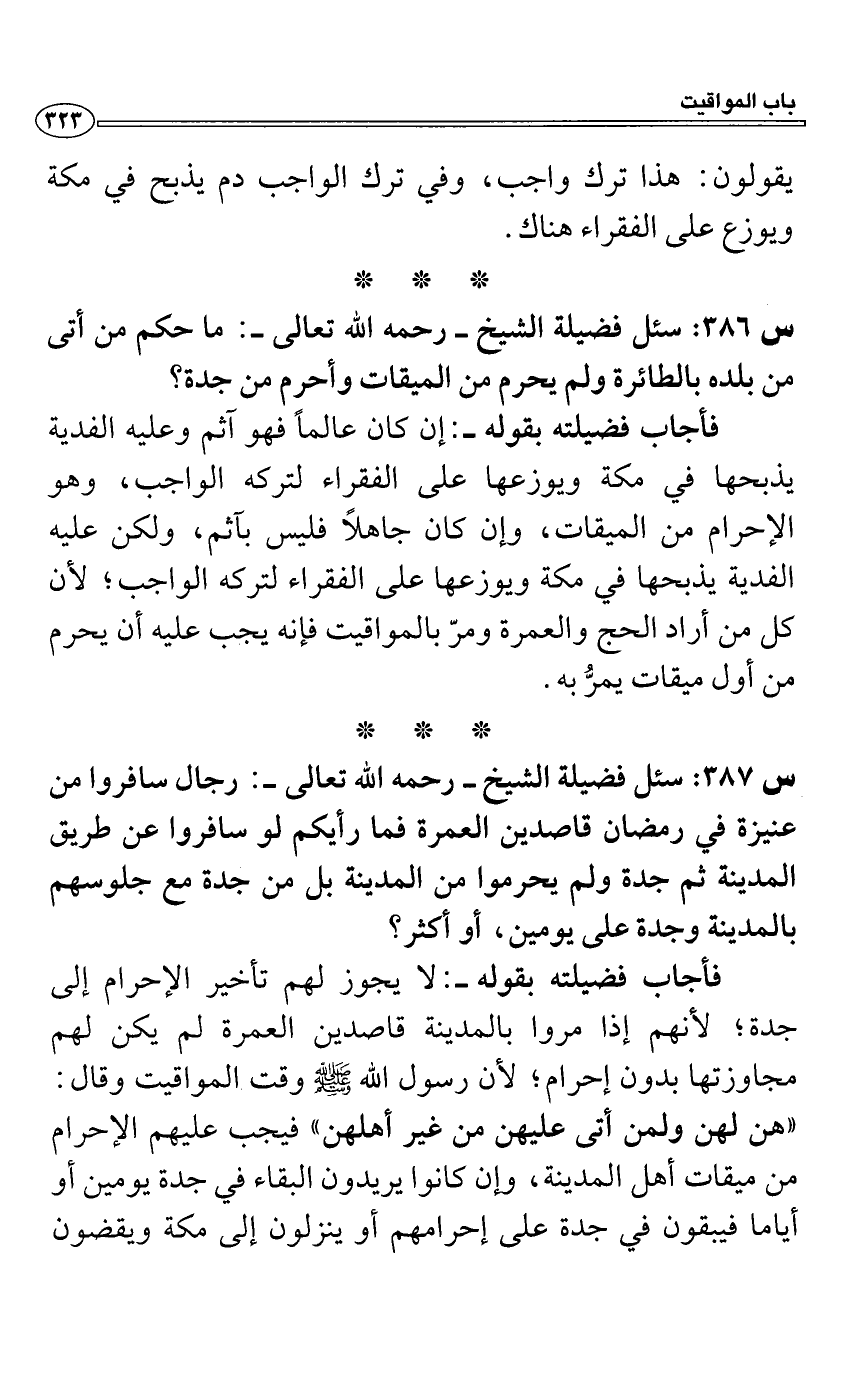 س 386: سئل فضيلة الشيخ- رحمه الله تعالى-: ما حكم من أتى من بلده بالطائرة ولم يحرم من الميقات وأحرم من جدة؟