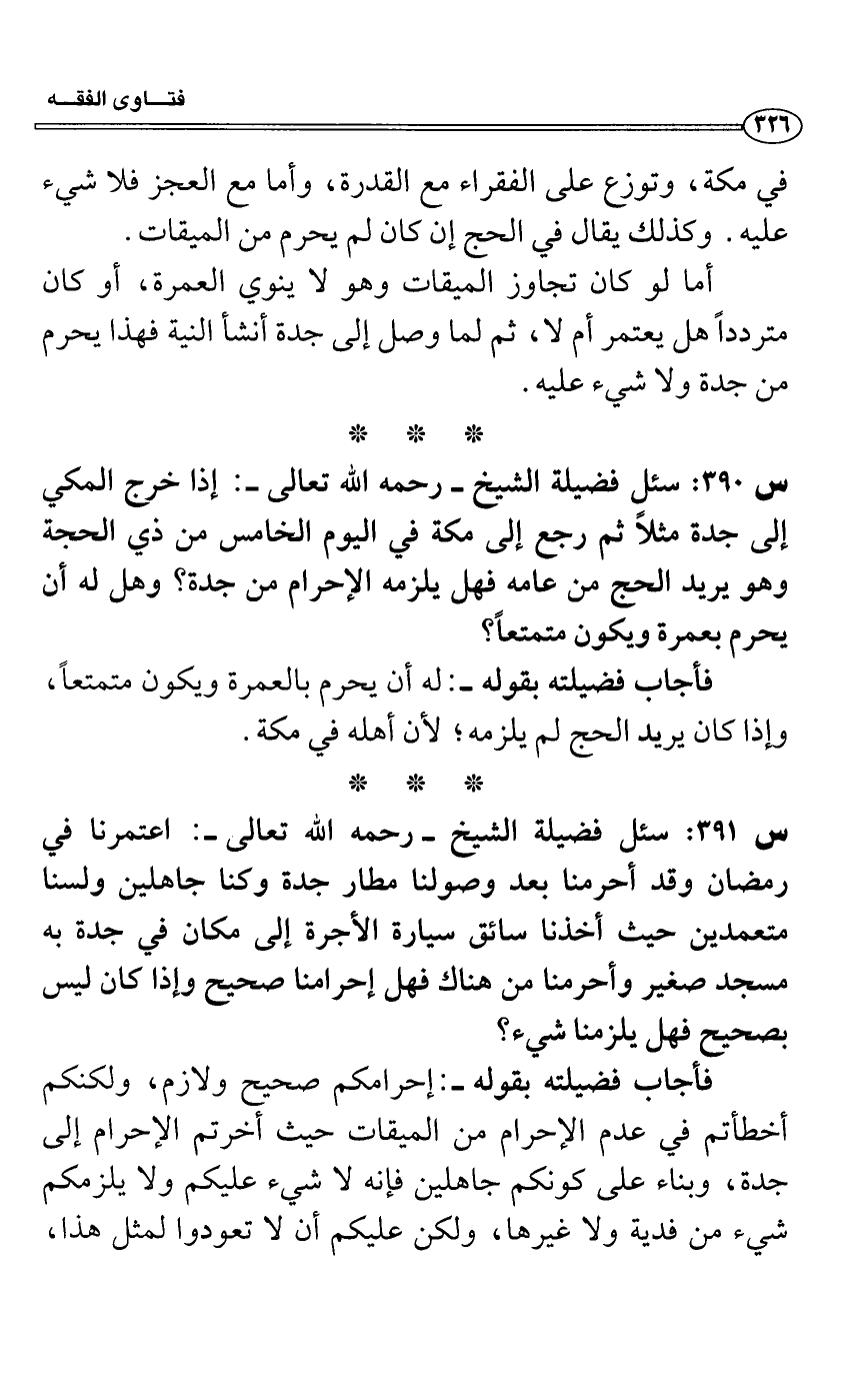 س 391: سئل فضيلة الشيخ- رحمه الله تعالى-: اعتمرنا في رمضان وقد أحرمنا بعد وصولنا مطار جدة وكنا جاهلين ولسنا متعمدين حيث أخذنا سائق سيارة الأجرة إلى مكان في جدة به مسجد صغير وأحرمنا من هناك فهل إحرامنا صحيح وإذا كان ليس بصحيح فهل يلزمنا شيء؟
