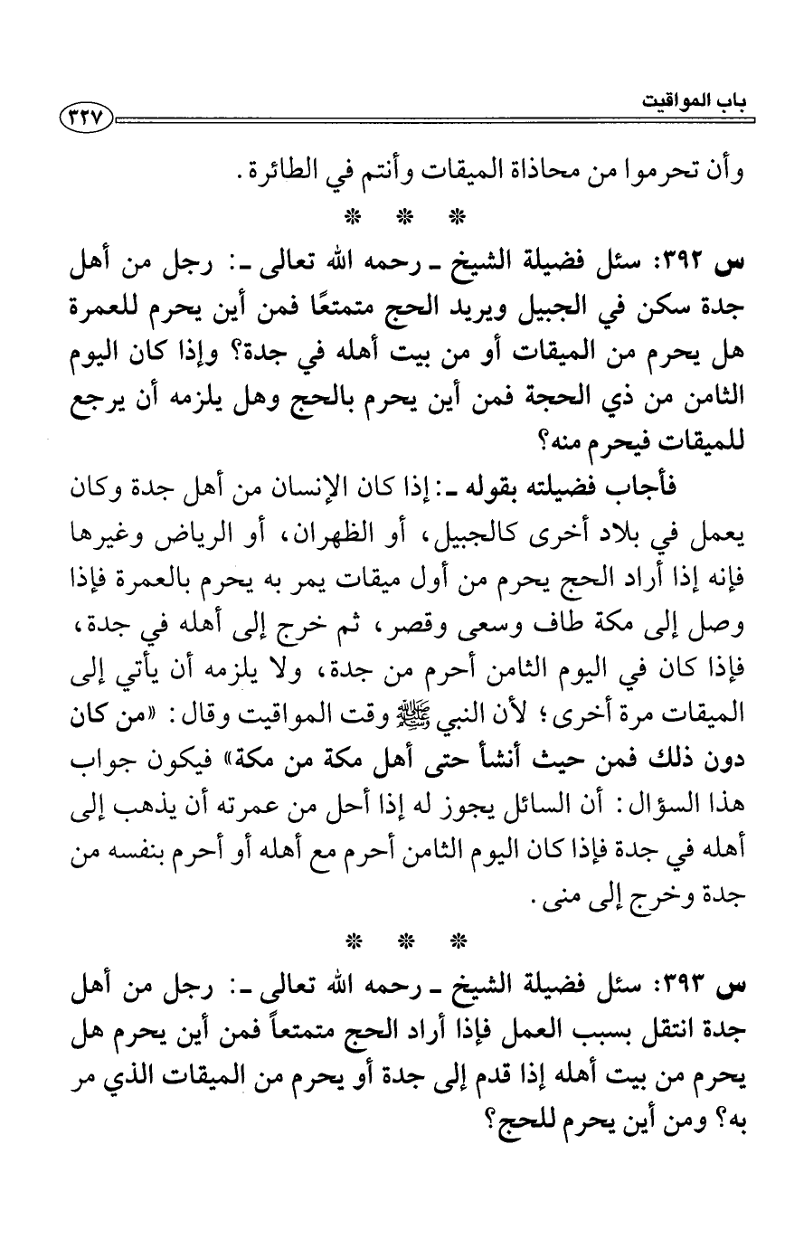 س 392: سئل فضيلة الشيخ- رحمه الله تعالى-: رجل من أهل جدة سكن في الجبيل ويريد الحج متمتعًا فمن أين يحرم للعمرة هل يحرم من الميقات أو من بيت أهله في جدة؟ وإذا كان اليوم