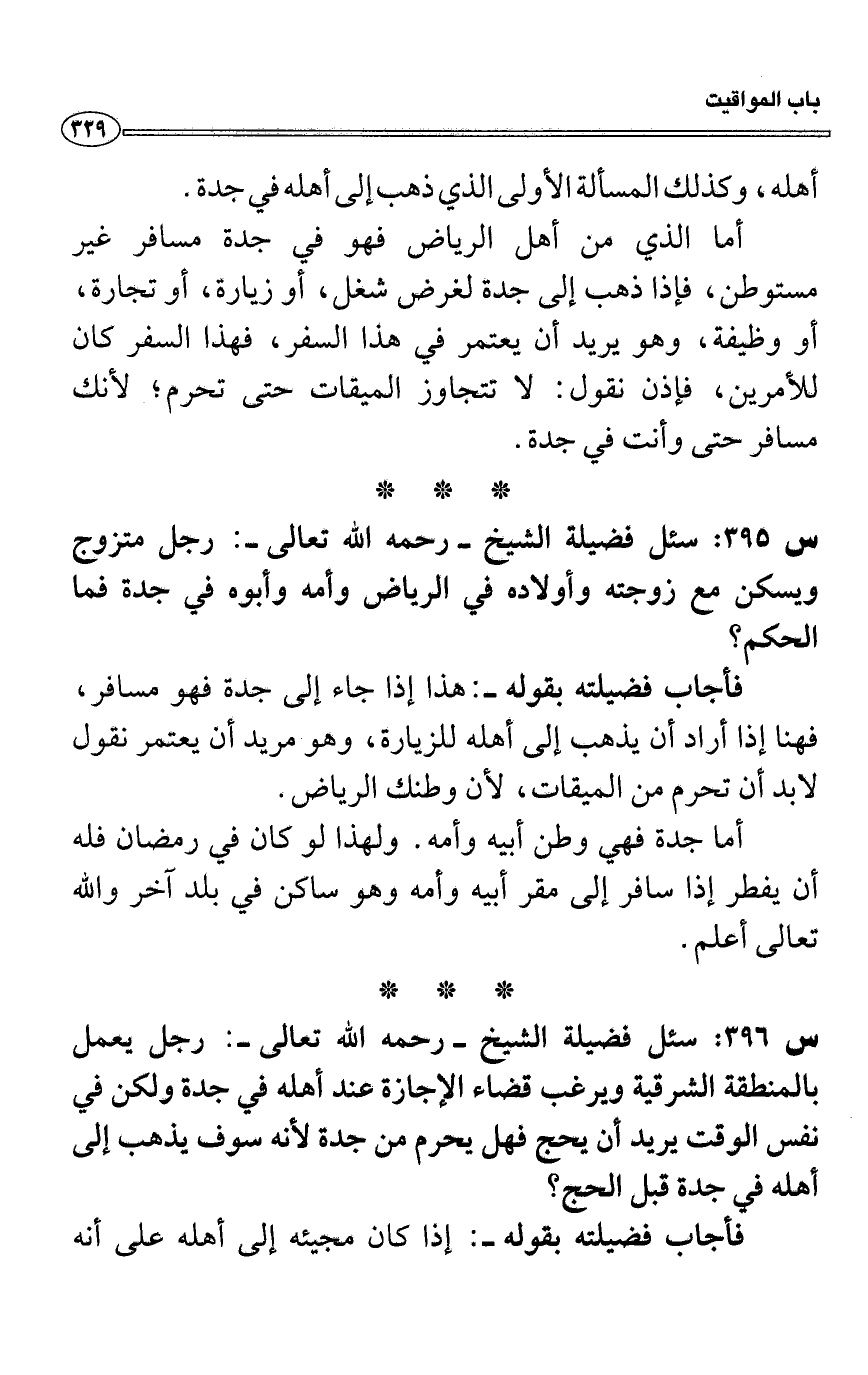 س 396: سئل فضيلة الشيخ- رحمه الله تعالى-: رجل يعمل بالمنطقة الشرقية ويرغب قضاء الإجازة عند أهله في جدة ولكن في نفس الوقت يريد أن يحج فهل يحرم من جدة لأنه سوف يذهب إلى أهله في جدة قبل الحج؟