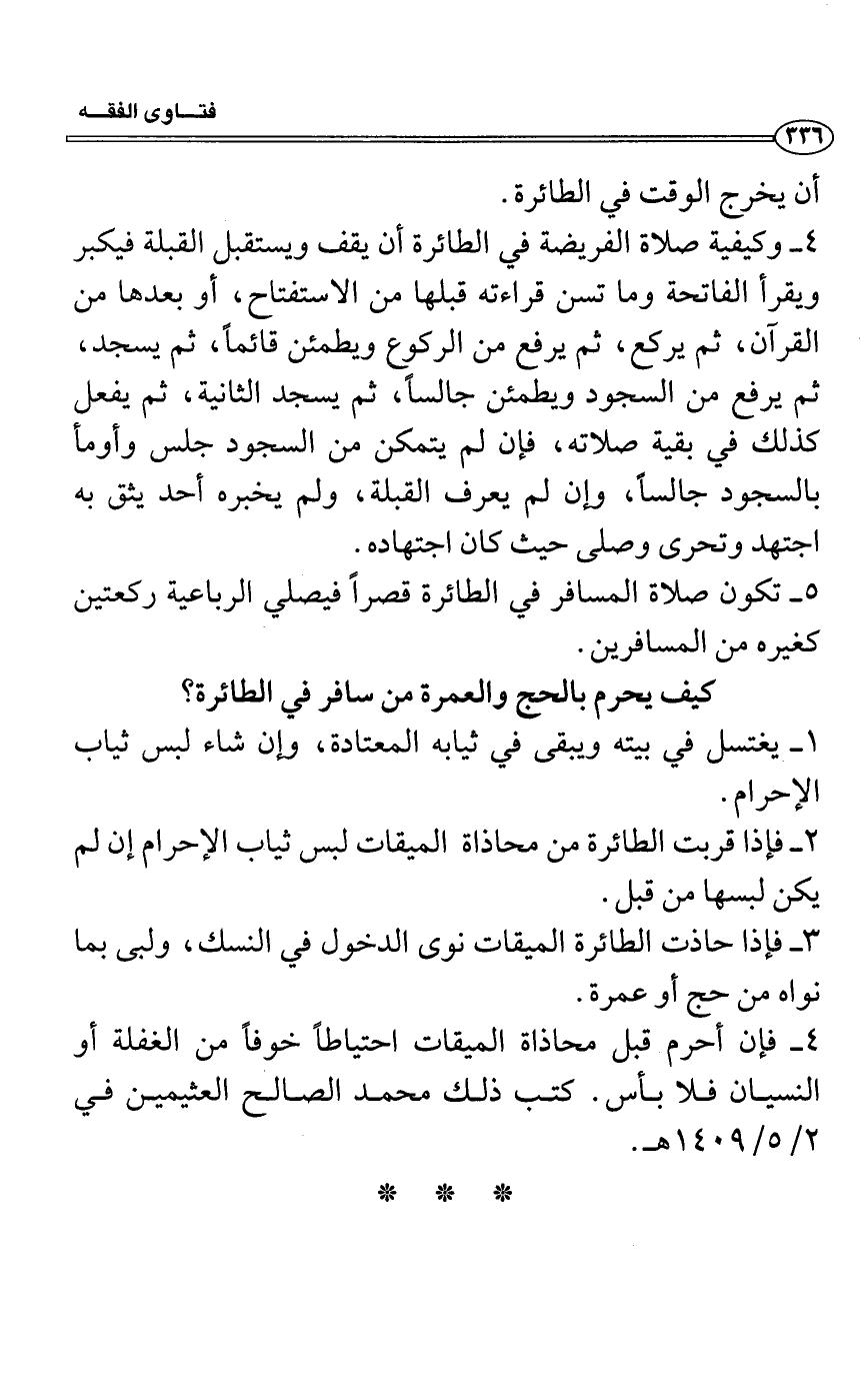 5- تكون صلاة المسافر في الطائرة قصراً فيصلي الرباعية ركعتين كغيره من المسافرين.