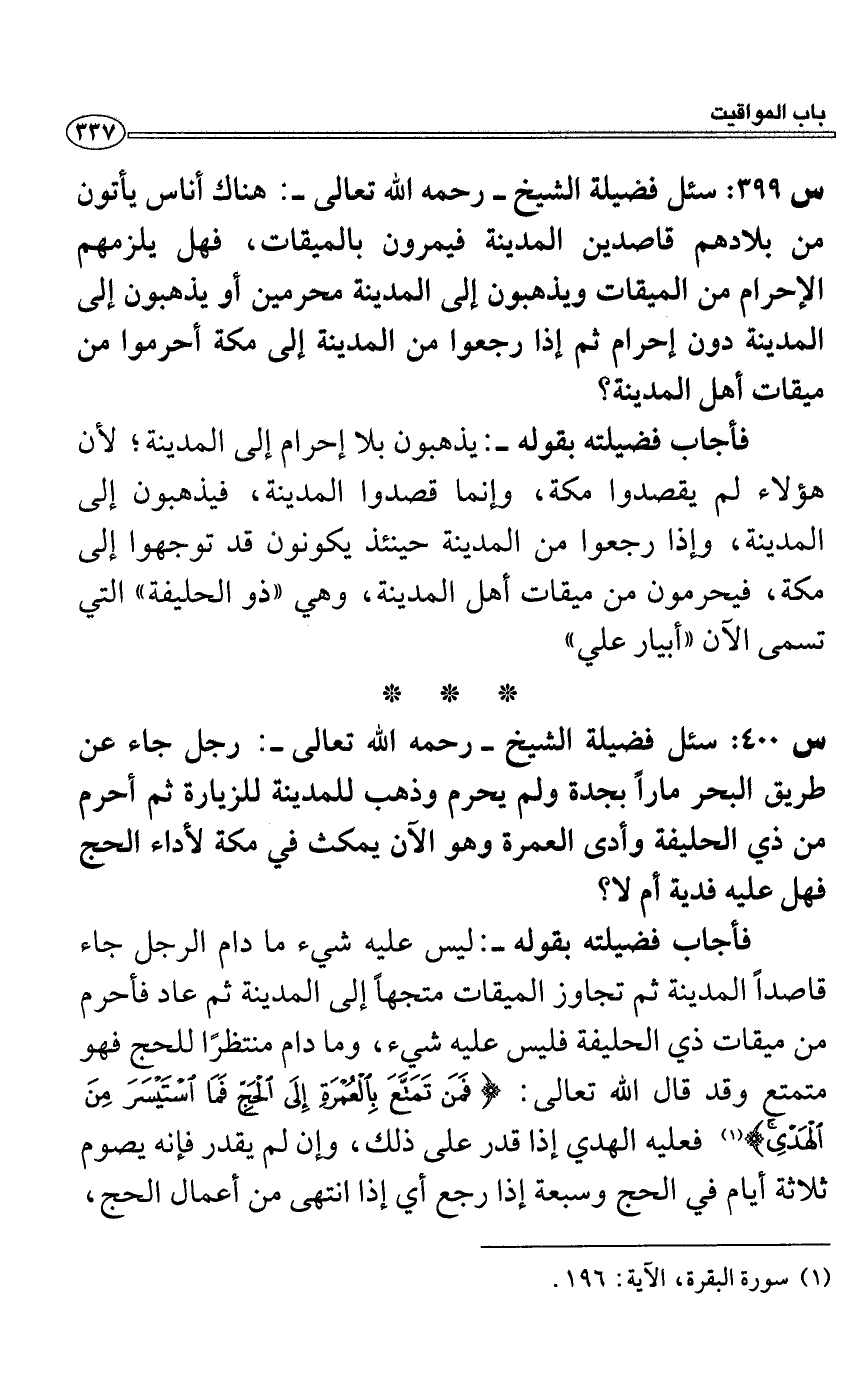 فأجاب فضيلته بقوله-: ليس عليه شيء ما دام الرجل جاء قاصداً المدينة ثم تجاوز الميقات متجهاً إلى المدينة ثم عاد فأحرم من ميقات ذي الحليفة فليس عليه شيء، وما دام منتظرًا للحج فهو متمتع وقد قال الله تعالى: (فَمَنْ تَمَتَّعَ بِالْعُمْرَةِ إِلَى الْحَجِّ فَمَا اسْتَيْسَرَ مِنَ الْهَدْيِ) (1) فعليه الهدي إذا قدر على ذلك، وإن لم يقدر فإنه يصوم ثلاثة أيام في الحج وسبعة إذا رجع أي إذا انتهى من أعمال الحج،