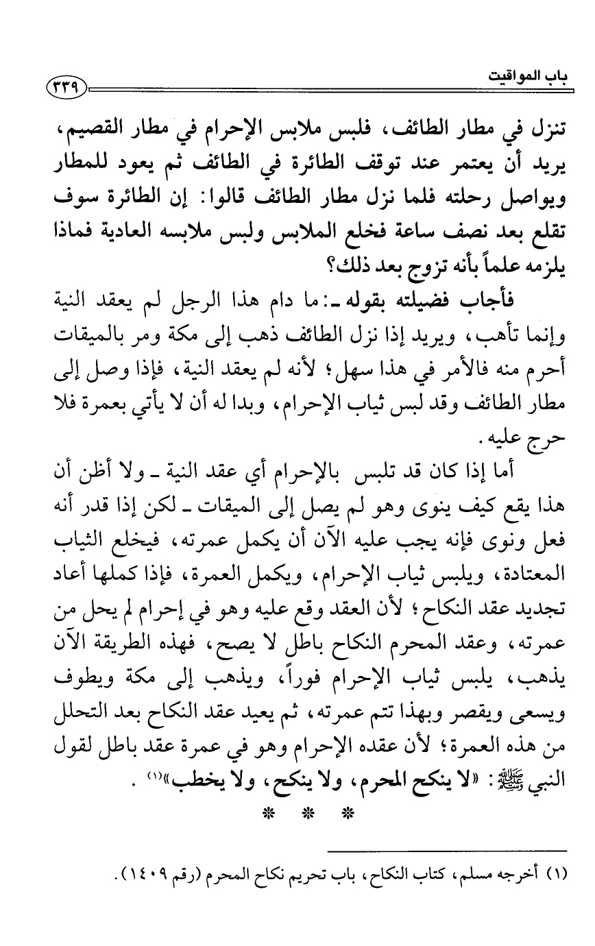 فأجاب فضيلته بقوله-: ما دام هذا الرجل لم يعقد النية وإنما تأهب، ويريد إذا نزل الطائف ذهب إلى مكة ومر بالميقات أحرم منه فالأمر في هذا سهل؛ لأنه لم يعقد النية، فإذا وصل إلى مطار الطائف وقد لبس ثياب الإحرام، وبدا له أن لا يأتي بعمرة فلا حرج عليه.
