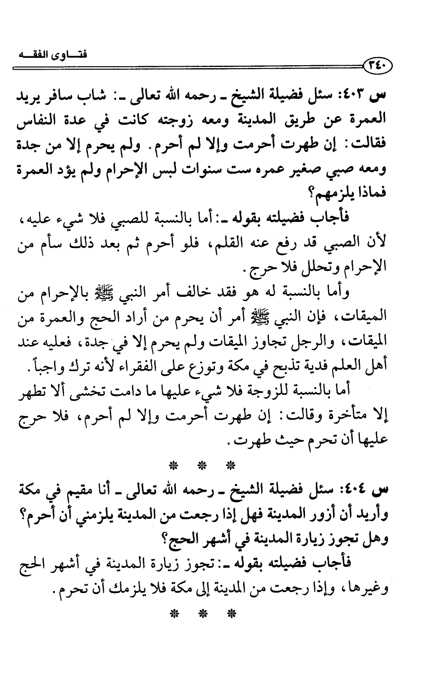 س 404: سئل فضيلة الشيخ- رحمه الله تعالى- أنا مقيم في مكة وأريد أن أزور المدينة فهل إذا رجعت من المدينة يلزمني أن أحرم؟ وهل تجوز زيارة المدينة في أشهر الحج؟