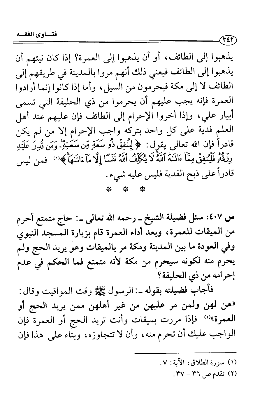 س 407: سئل فضيلة الشيخ- رحمه الله تعالى-: حاج متمتع أحرم من الميقات للعمرة، وبعد أداء العمرة قام بزيارة المسجد النبوي وفي العودة ما بين المدينة ومكة مر بالميقات وهو يريد الحج ولم