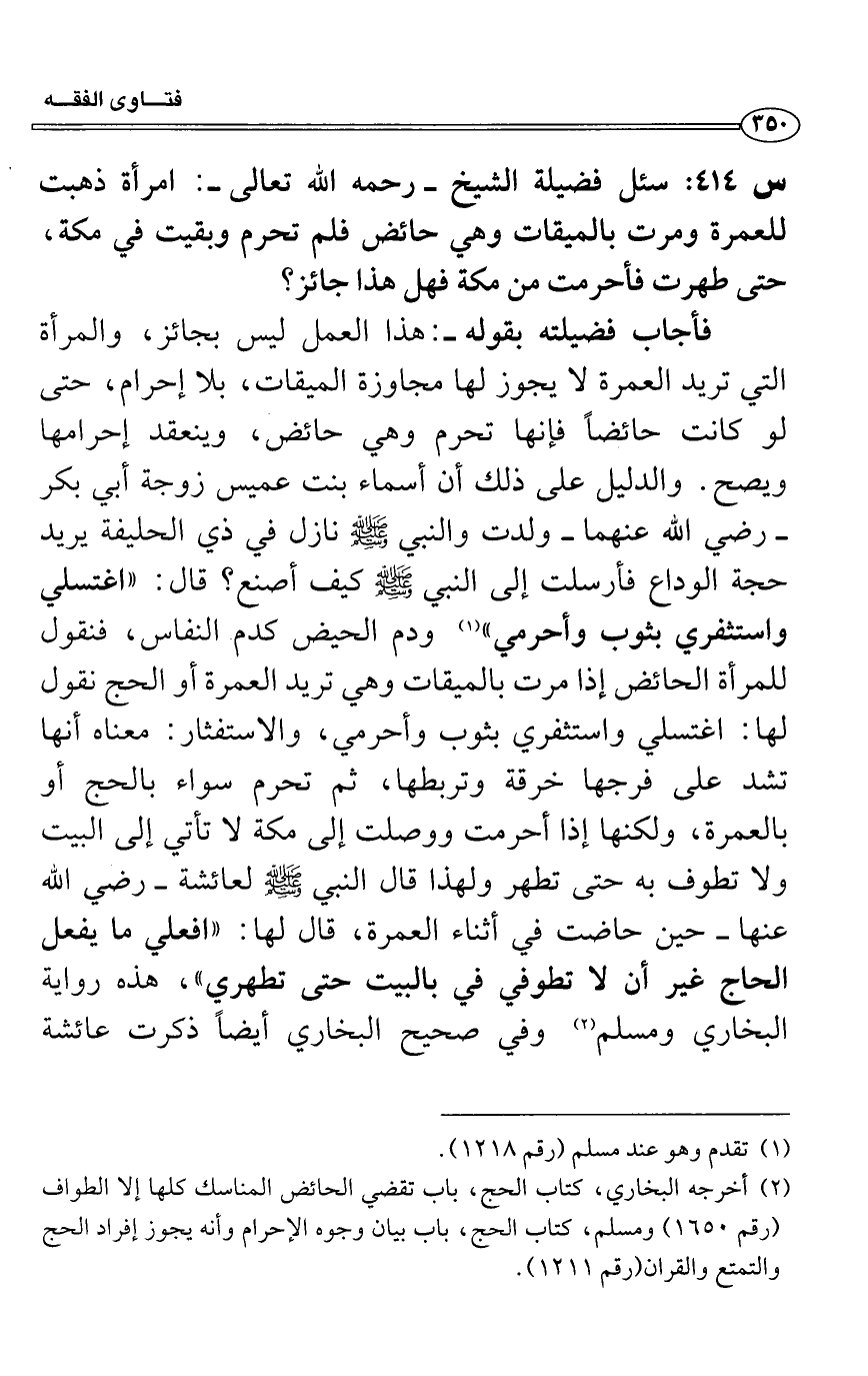 فأجاب فضيلته بقوله-: هذا العمل ليس بجائز، والمرأة التي تريد العمرة لا يجوز لها مجاوزة الميقات، بلا إحرام، حتى لو كانت حائضاً فإنها تحرم وهي حائض، وينعقد إحرامها ويصح. والدليل على ذلك أن أسماء بنت عميس زوجة أبي بكر - رضي الله عنهما- ولدت والنبي - صلى الله عليه وسلم - نازل في ذي الحليفة يريد حجة الوداع فأرسلت إلى النبي - صلى الله عليه وسلم - كيف أصنع؟ قال: "اغتسلي واستثفري بثوب وأحرمي " (1) ودم الحيض كدم النفاس، فنقول للمرأة الحائض إذا مرت بالميقات وهي تريد العمرة أو الحج نقول لها: اغتسلي واستثفري بثوب وأحرمي، والاستفثار: معناه أنها تشد على فرجها خرقة وتربطها، ثم تحرم سواء بالحج أو بالعمرة، ولكنها إذا أحرمت ووصلت إلى مكة لا تأتي إلى البيت ولا تطوف به حتى تطهر ولهذا قال النبي - صلى الله عليه وسلم - لعائشة- رضي الله عنها- حين حاضت في أثناء العمرة، قال لها: "افعلي ما يفعل الحاج غير أن لا تطوفي في بالبيت حتى تطهري "، هذه رواية البخاري ومسلم (2) وفي صحيح البخاري أيضاً ذكرت عائشة