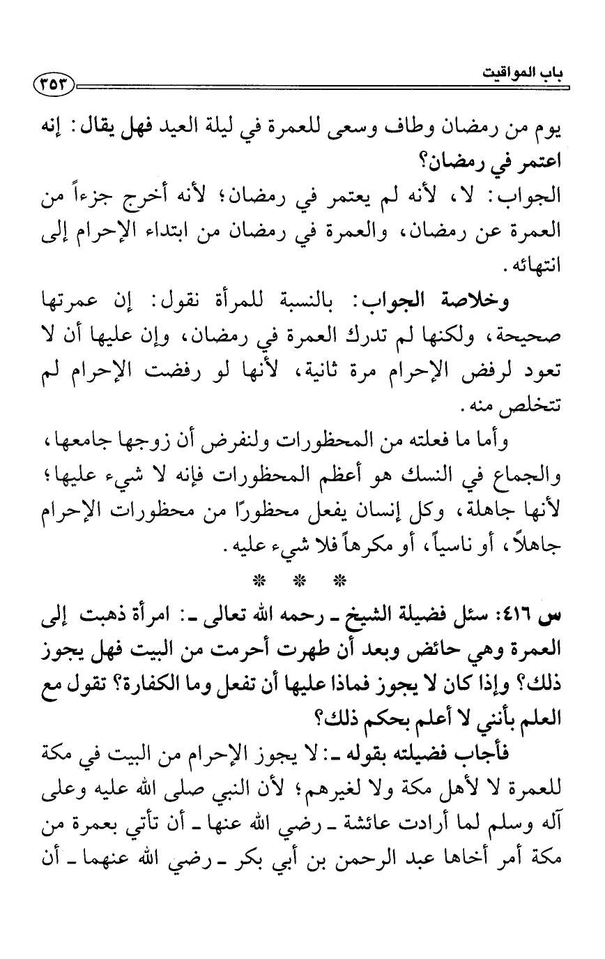 س 416: سئل فضيلة الشيخ- رحمه الله تعالى-: امرأة ذهبت إلى العمرة وهي حائض وبعد أن طهرت أحرمت من البيت فهل يجوز ذلك؟ وإذا كان لا يجوز فماذا عليها أن تفعل وما الكفارة؟ تقول مع العلم بأنني لا أعلم بحكم ذلك؟